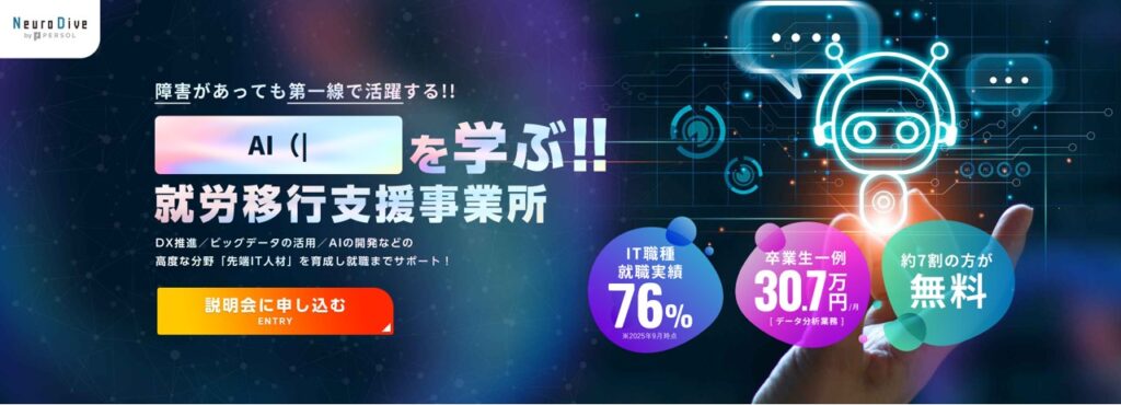 AIやデータサイエンスが学べるIT特化の就労移行支援【Neuro Dive】は、発達障害などのある方を対象とした就労移行支援事業所です。