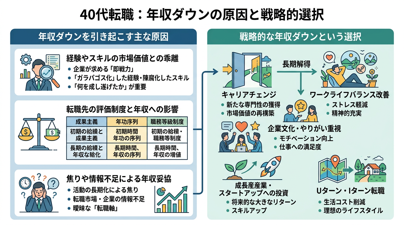 年収が下がったとしても、仕事の充実感ややりがい、ワークライフバランス、人間関係、スキルアップの機会など、年収以外の要素を重視した転職は、40代以降の人生を豊かにする選択となり得ます。 特に、成長産業への転職や、将来的な起業を見据えたノウハウ習得のための年収ダウンは、戦略的なキャリア形成の一環として有効です。
