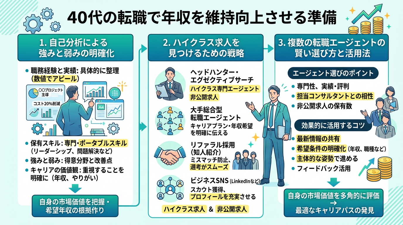 40代での転職は、これまでのキャリアで培ってきた経験やスキルを最大限に活かし、年収を維持または向上させる絶好の機会となり得ます。そのためには、戦略的な準備が不可欠です。ここでは、自己分析からハイクラス求人の探し方、そして転職エージェントの活用法まで、年収アップを目指すための具体的な準備について解説します。