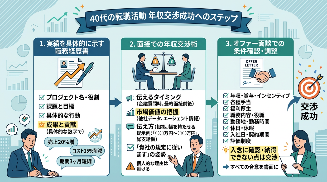 40代での転職において、年収を維持・向上させるためには、積極的かつ戦略的な年収交渉が不可欠です。豊富な経験と実績を持つ40代だからこそ、その価値を企業に正しく伝え、納得のいく条件を引き出すことができます。ここでは、年収交渉を成功させるための具体的なポイントを解説します。