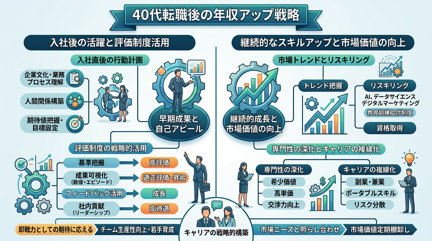 転職後、年収をアップさせるためには、早期に成果を出し、自身の価値を社内外に示すことが不可欠です。40代の転職者には即戦力としての期待が寄せられるため、その期待に応えることが評価と年収に直結します。